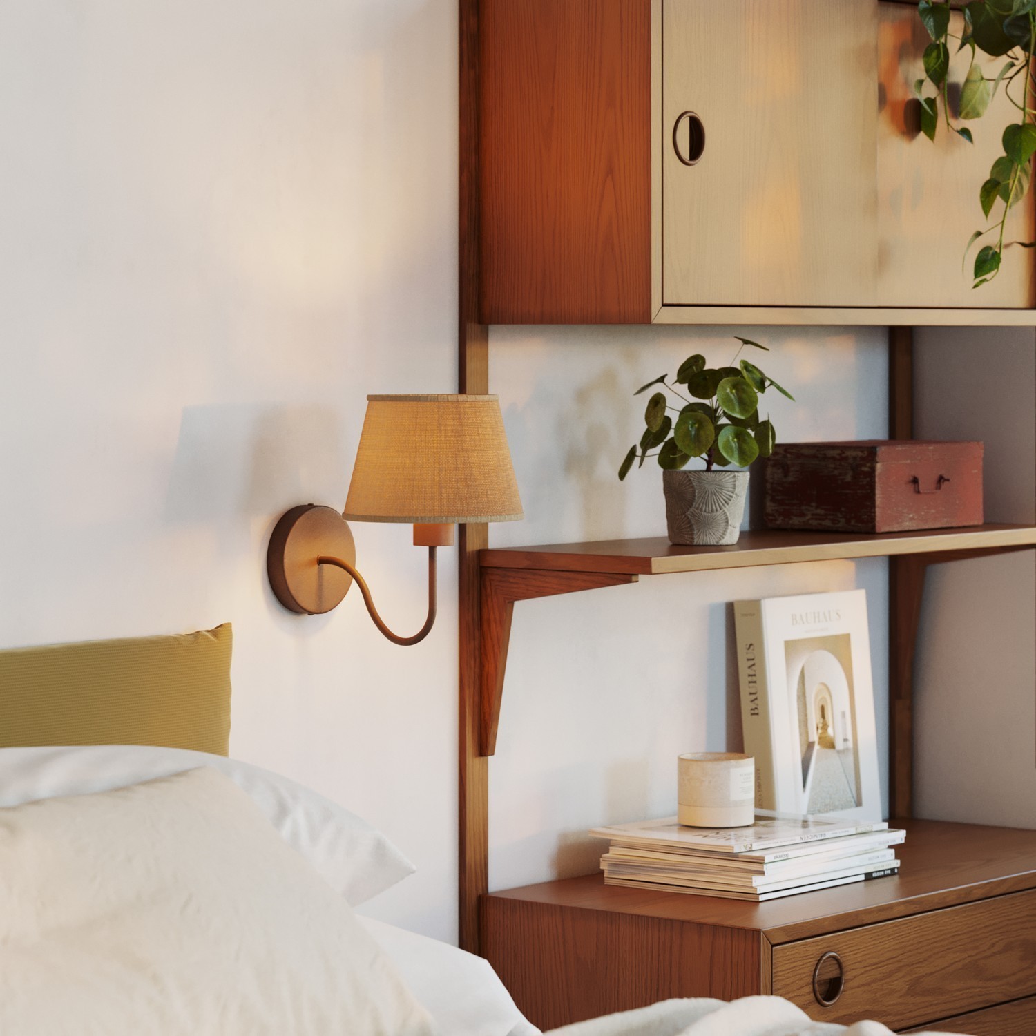 Il Fermaluce con estensione a S incontra il paralume Impero, creando un punto luce dal carattere autentico e delicato. Il rosone in metallo e la curva a S sostengono il paralume con equilibrio, portando sulla parete una luminosità calda e accogliente.